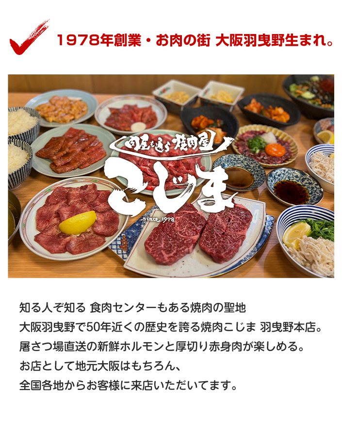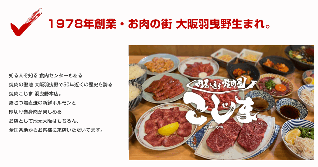 知る人ぞ知る 食肉センターもある焼肉の聖地 大阪羽曳野で50年近くの歴史を誇る焼肉こじま 羽曳野本店。屠さつ場直送の新鮮ホルモンと厚切り赤身肉が楽しめるお店として地元大阪はもちろん、全国各地からお客様に来店いただいてます。