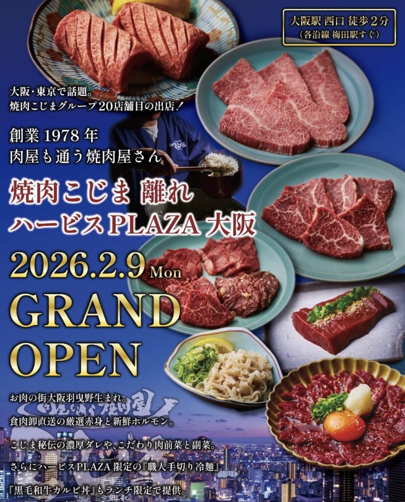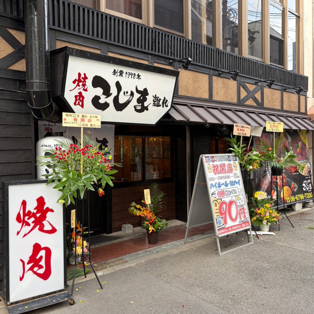看板メニュー国産牛ハラミや黒毛和牛A5カルビ、生センマイ、ハラミユッケ、塩タン等食肉卸業者直送の赤身やホルモンを安心価格で楽しめる『焼肉こじま離れ』